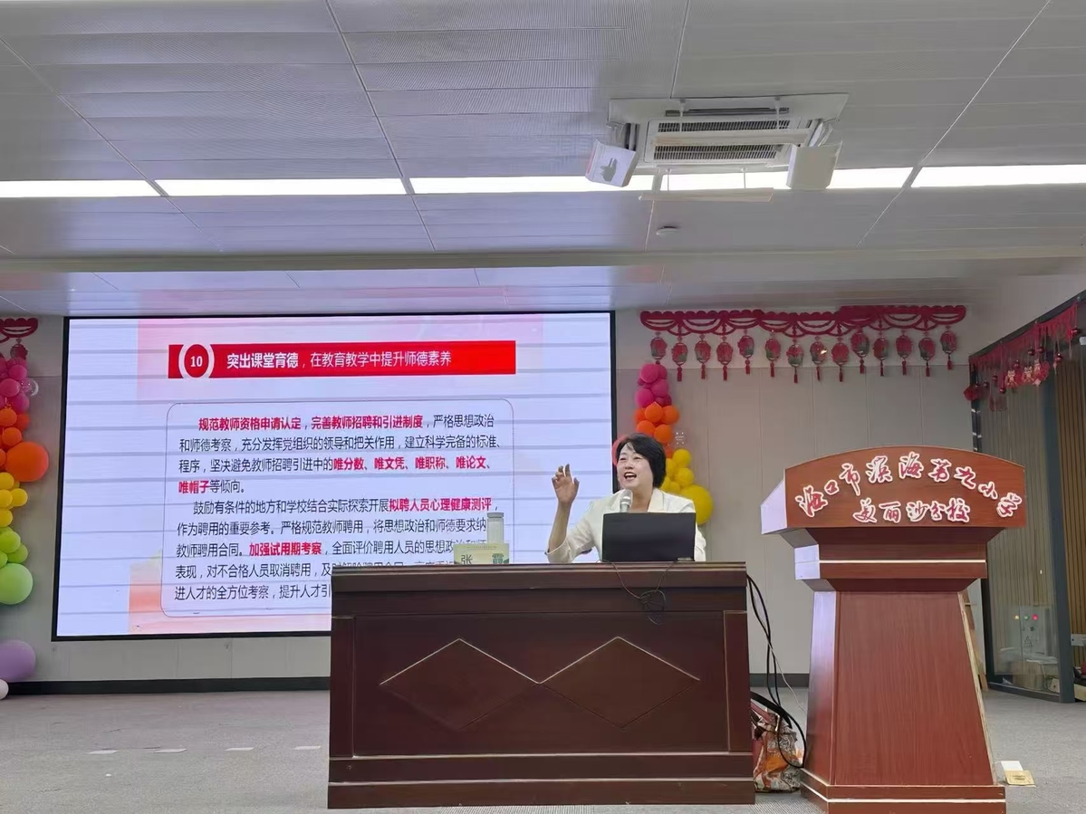为强化教师队伍建设、提升教师职业道德素养、筑牢立德树人思想根基,2025年8月26日上午,海口市滨海第九小学美丽沙分校举办“以德立学,以德施教”师德师风培训活动。我院张霞教授应邀主讲,该校校领导及250余名教师参会,活动由陈青蔓老师主持。