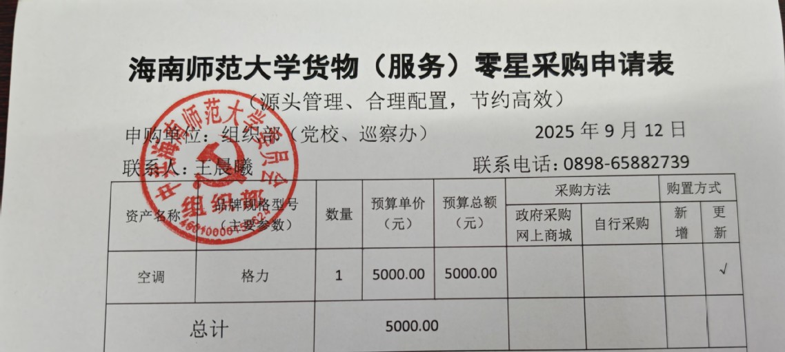 因工作需要,特申请购置1台空调,根据学校相关规定,对购置物品明细公示如下,公示时间2025年9月12日至2025年9月16日,如有疑义,请致电0898-65882739。特此公示。